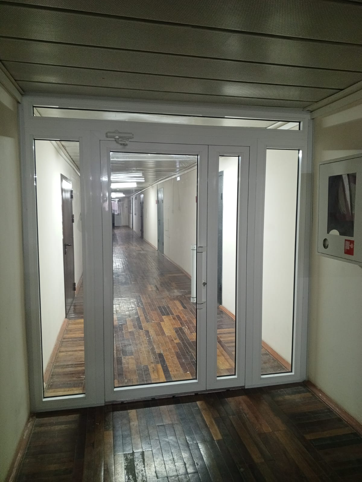 Различные двери, перегородки, окна или шкафы могут быть выполнены из одинакового материала и с одинаковым стилем, с заполнением стеклопакетами или стеклом, возможно частичное или полное матирование стекол.