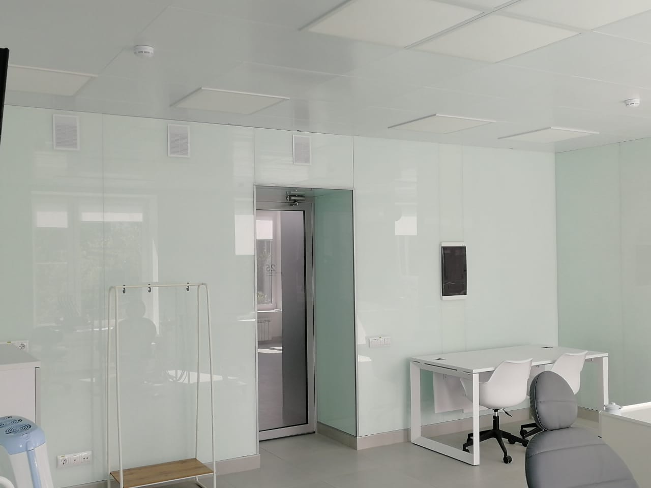 Оклейка стен окрашенным стеклом в "Стоматологии №1" г.Белгород
